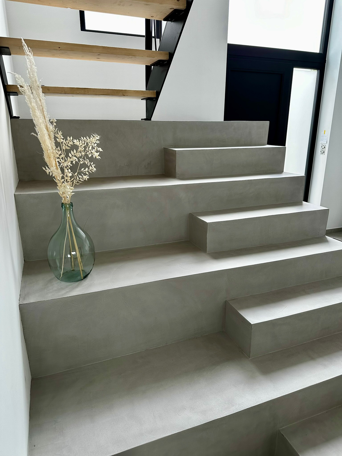 À Offaing, nous avons conçu un escalier en béton ciré composé de 8 marches. Ce matériau offre une finition lisse et moderne qui s’intègre parfaitement dans un intérieur contemporain.