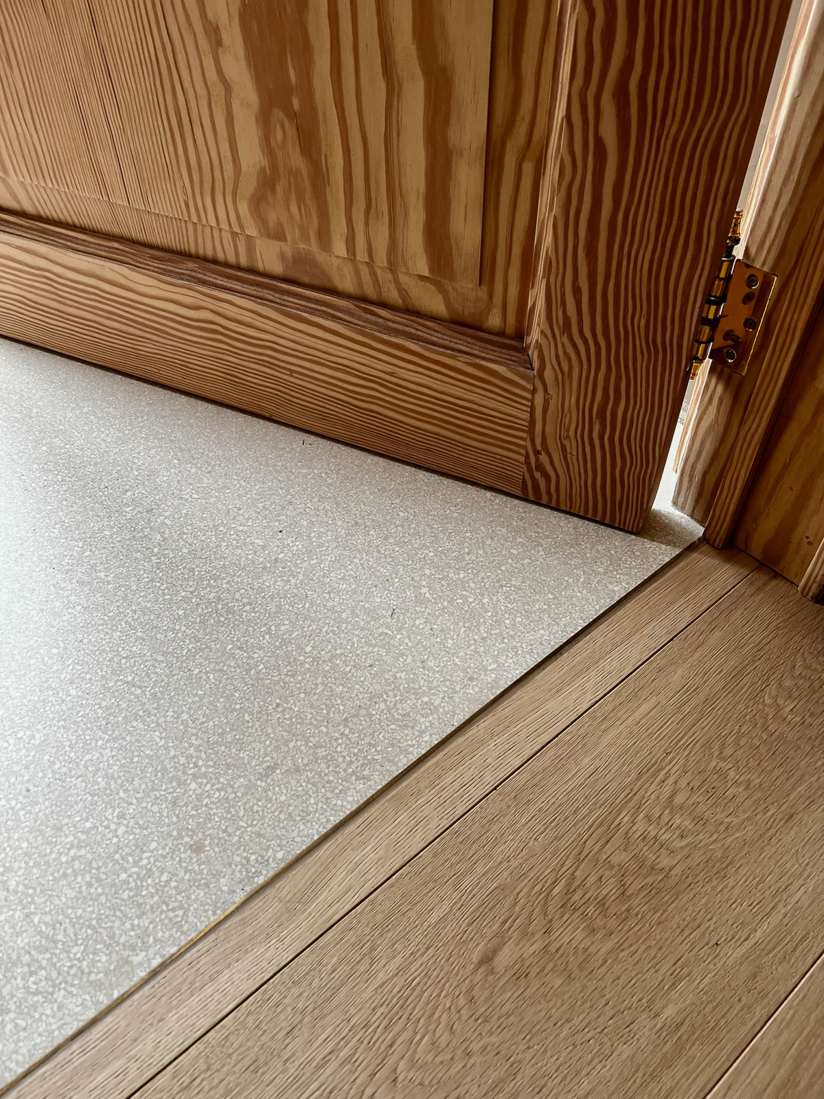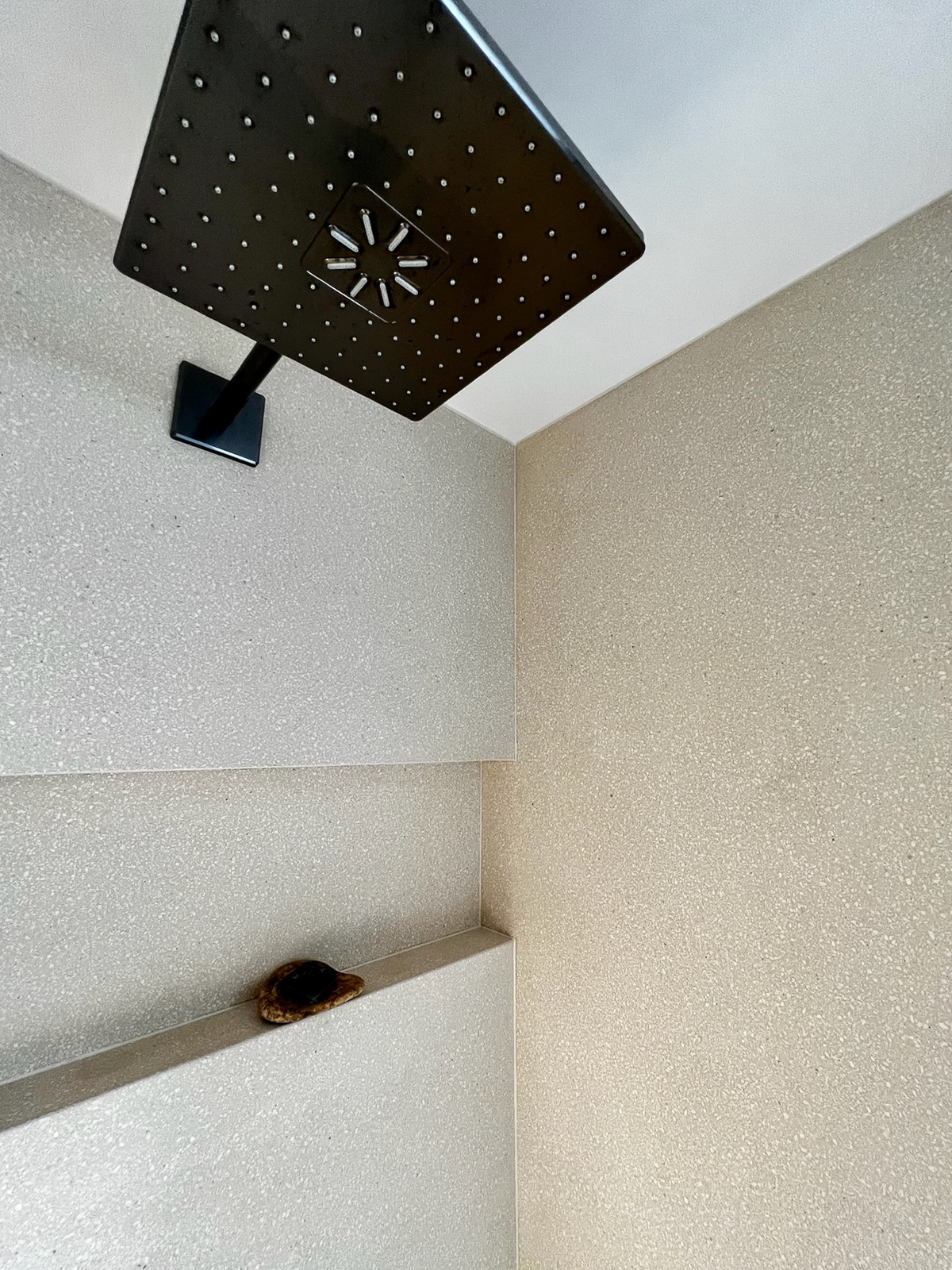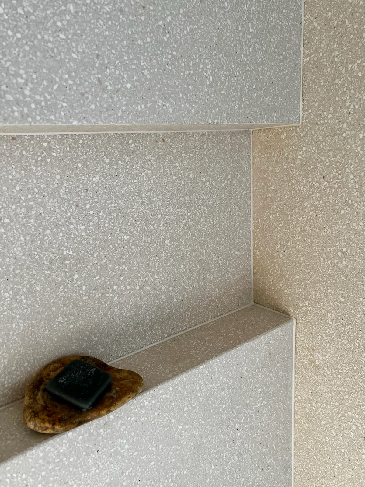 À Witimont, nous avons aménagé une salle de bain complète en terrazzo. Du sol aux finitions, ce matériau apporte un rendu élégant et original grâce à ses éclats minéraux colorés.