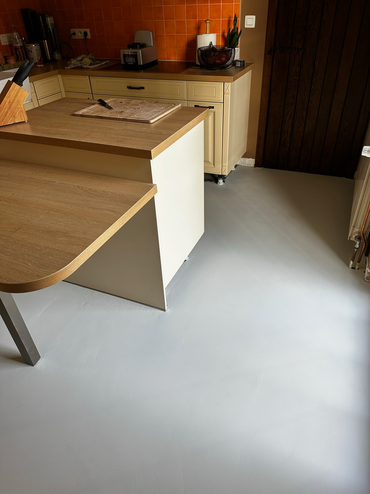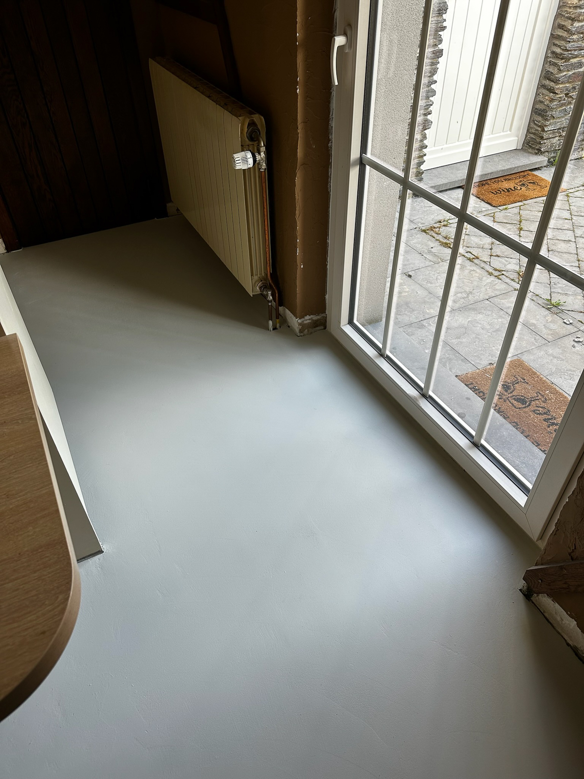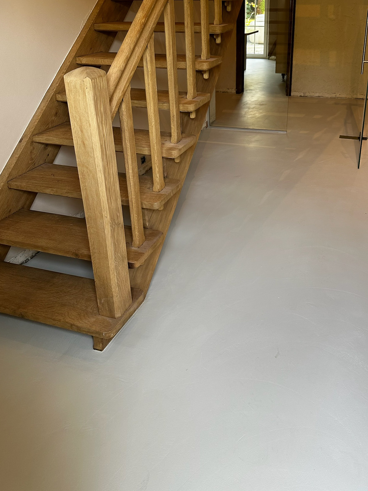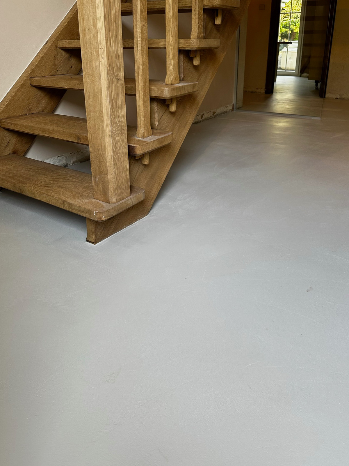 À Libramont, nous avons posé un sol en béton ciré sur l’ensemble du rez-de-chaussée, apportant une continuité élégante et contemporaine aux espaces de vie. Sa finition lisse et uniforme met en valeur la luminosité et la modernité de l’habitation.