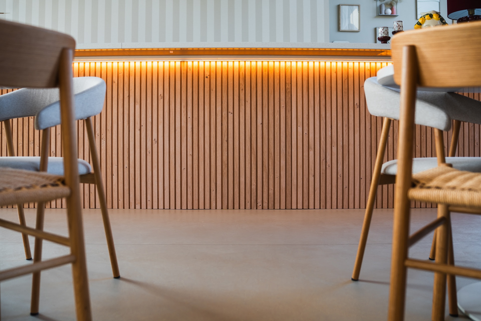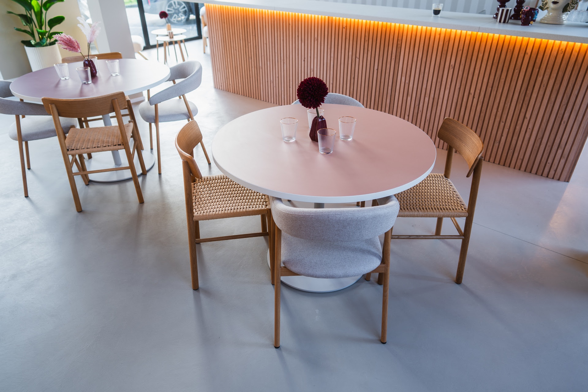 Idéal pour les environnements exigeants comme la restauration, ce matériau garantit durabilité, hygiène et facilité d’entretien. Sa finition continue apporte une sensation d’espace et un rendu contemporain parfaitement adapté à l’ambiance du restaurant.
